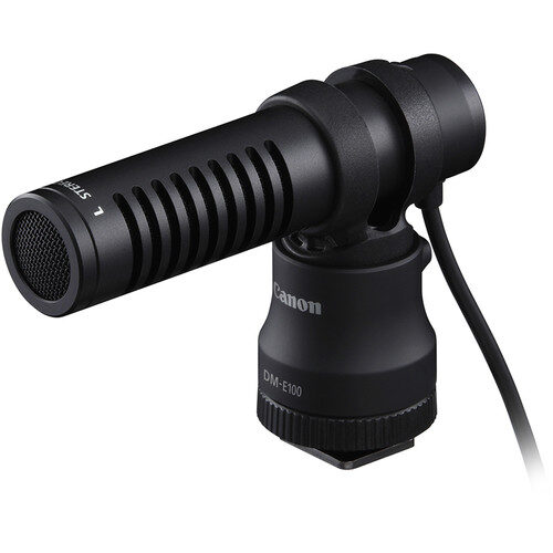Designed to improve audio quality while recording video, the Canon DM-E100 Directional Microphone is a shoe-mounted, wired external mic with a 3.5mm plug. The directional design is suitable for a variety of recording applications and a windscreen is included to reduce wind noise when working in noisier and outdoor environments.