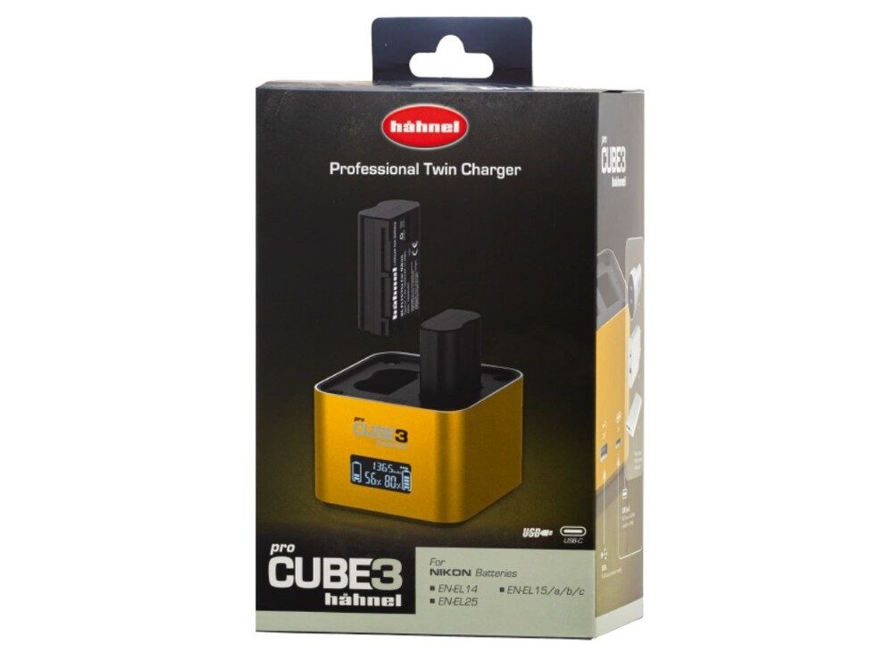 The HAHNEL PROCUBE 3 for Nikon is a versatile dual charger designed for Nikon EN-EL14, EN-EL15, and EN-EL25 batteries. It allows for simultaneous charging of two batteries and features a USB output for charging additional devices. The charger includes an LCD display for monitoring charge status and interchangeable battery plates for added convenience. A 12V car adapter is also included for on-the-go charging.