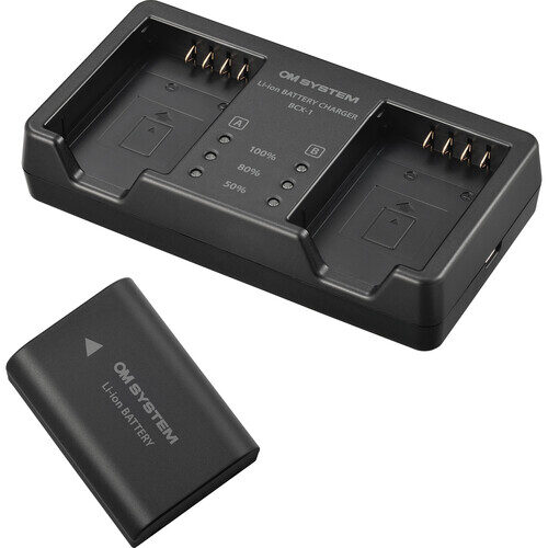 The SBCX-1 Lithium-Ion Battery and Charger Kit from OM SYSTEM includes one BLX-1 Lithium-Ion Battery and recharges one or two BLX-1 batteries at the same time.